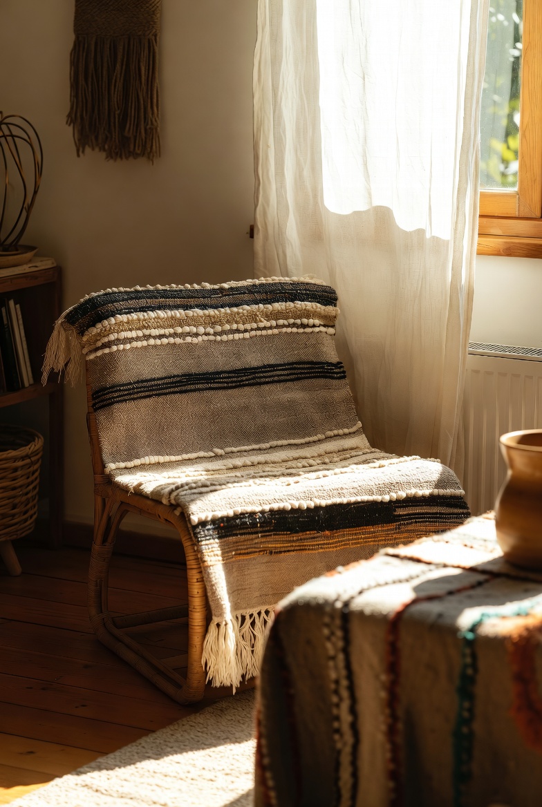- Consider adding a handwoven rug underfoot to ground the room and tie various elements together.