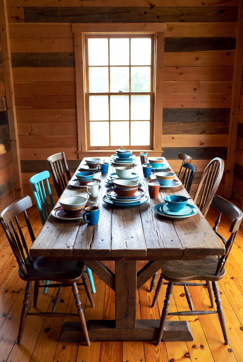 Position a large wooden dining table at the center of your kitchen or dining area, where it can serve as a gathering spot for family and friends. Balance the rustic appeal with modern accents, such as sleek dining chairs or contemporary tableware, creating a harmonious blend of old and new. Additionally, you can use wooden shelving on your walls to display plants or handcrafted ceramics, further enhancing the rustic feel.