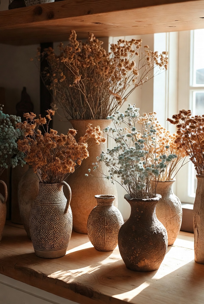 Consider incorporating a mix of sizes and shapes for a layered, curated look. Fill them with fresh flowers, dried botanicals, or leave them empty as stunning standalone pieces. Position them on a windowsill or an open shelf; they provide a warm, inviting feel that softens the hard edges of modern design.
