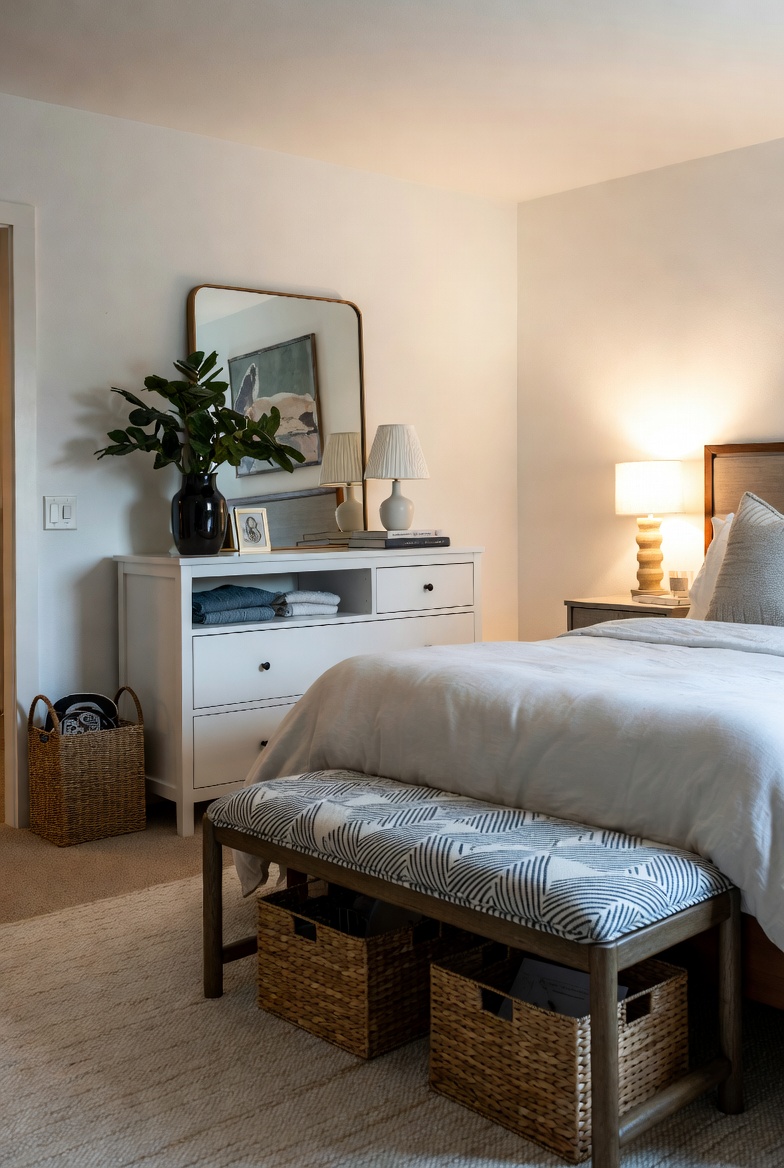 One of the keys to a restful bedroom is maintaining a clutter-free environment. Implementing clever storage solutions can keep your space looking serene and organized. Consider using under-bed storage boxes for seasonal clothing or excess linens; this keeps them accessible yet out of sight. A stylish storage ottoman at the foot of your bed adds both seating and a discreet area to store extra blankets or books.