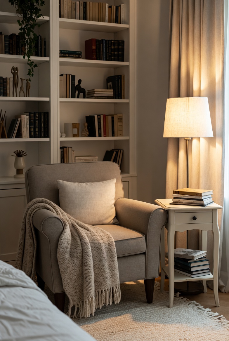 Transform a corner of your bedroom into a cozy reading nook that invites relaxation and escape. Start with comfortable seating, such as a plush armchair or a charming chaise lounge, placed near a window to take advantage of natural light. Consider adding a small side table for your cup of tea or coffee, creating a perfect spot to lose yourself in a novel.