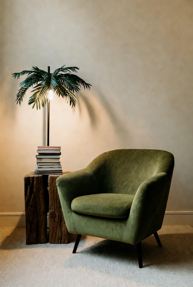 Enhance the atmosphere with soft, layered textiles. Consider a woven throw blanket draped over the chair and a couple of nature-themed pillows. Avoid harsh overhead lighting; instead, opt for a standing or table lamp with a warm light bulb that casts a comforting glow. Incorporate bookshelves made of reclaimed wood or even a small plant stand with trailing vines to keep the place feeling lush and inviting.