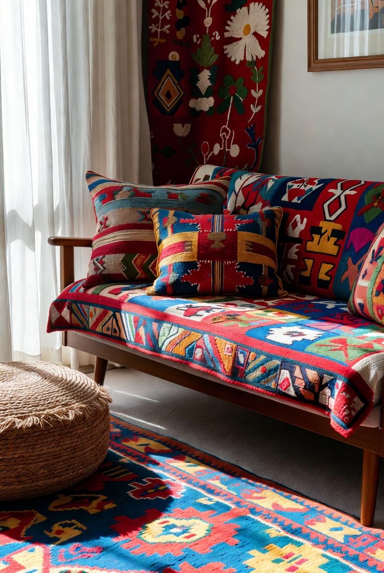 To implement this idea effectively, consider mixing patterns in your cushions—perhaps a bold tribal design alongside a subtle geometric print. Layering different textures, such as a soft velvet throw over a woven linen cushion, will also create depth. Don’t shy away from bringing in a statement area rug; a bright kilim or a hand-knotted Persian rug can anchor the room, adding a splash of color underfoot.