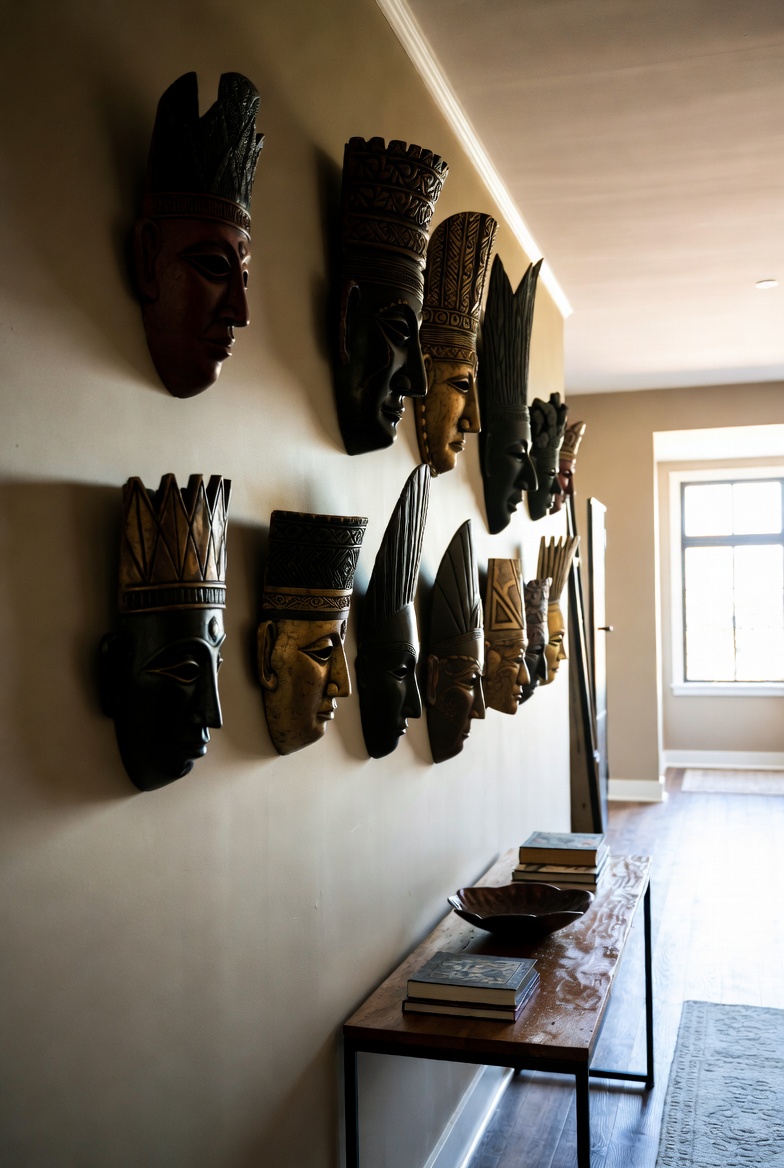 When placing masks, consider creating a dedicated space, such as a feature wall or a narrow console table. You could curate a collection of masks from different regions, allowing each piece’s unique characteristics to stand out. Mixing sizes and styles will draw the eye and create a visually stimulating atmosphere.