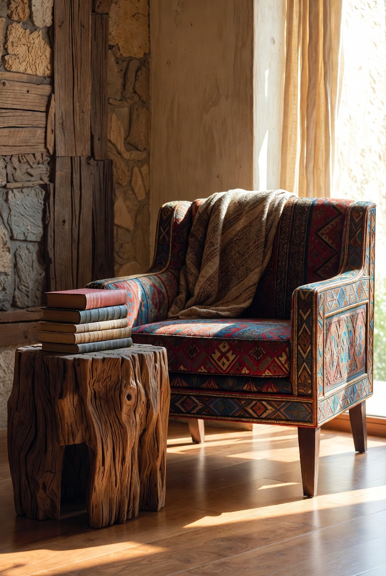 - Utilize an African wooden stool for an unexpected, rustic element.