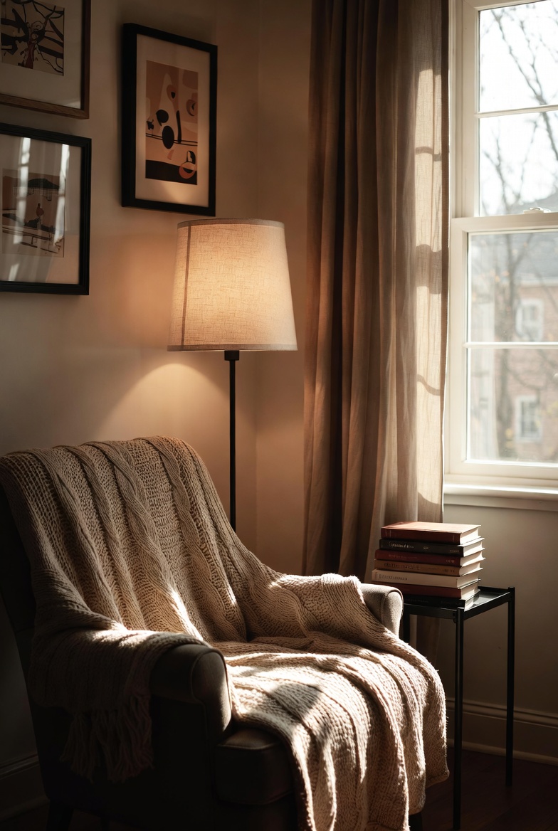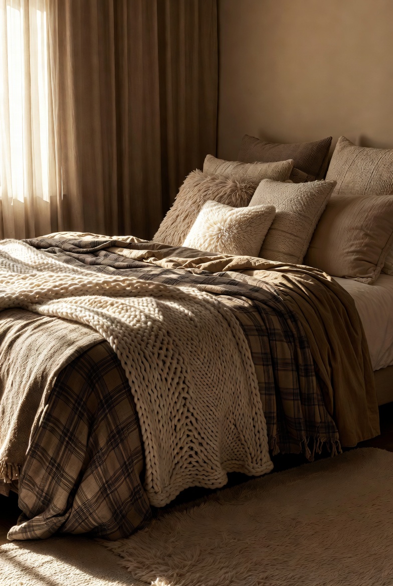 - Mix various textiles in warm hues to create a cozy feel.