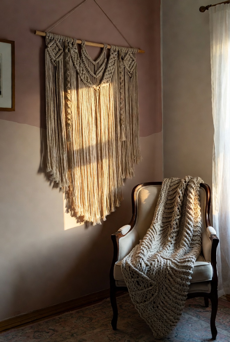 - Pair smaller macramé accents with framed art for a dynamic gallery wall.