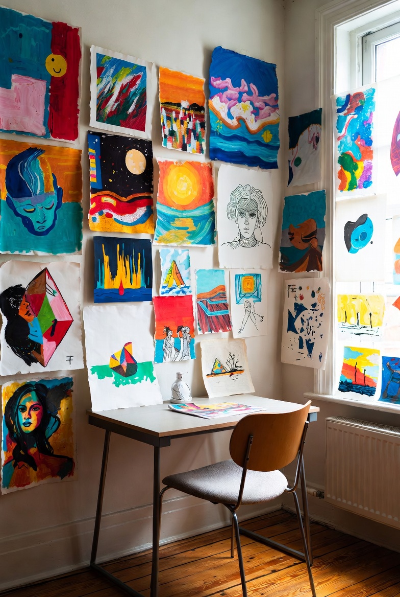 - Utilize a shared space, like a hallway, for eclectic artwork display.
